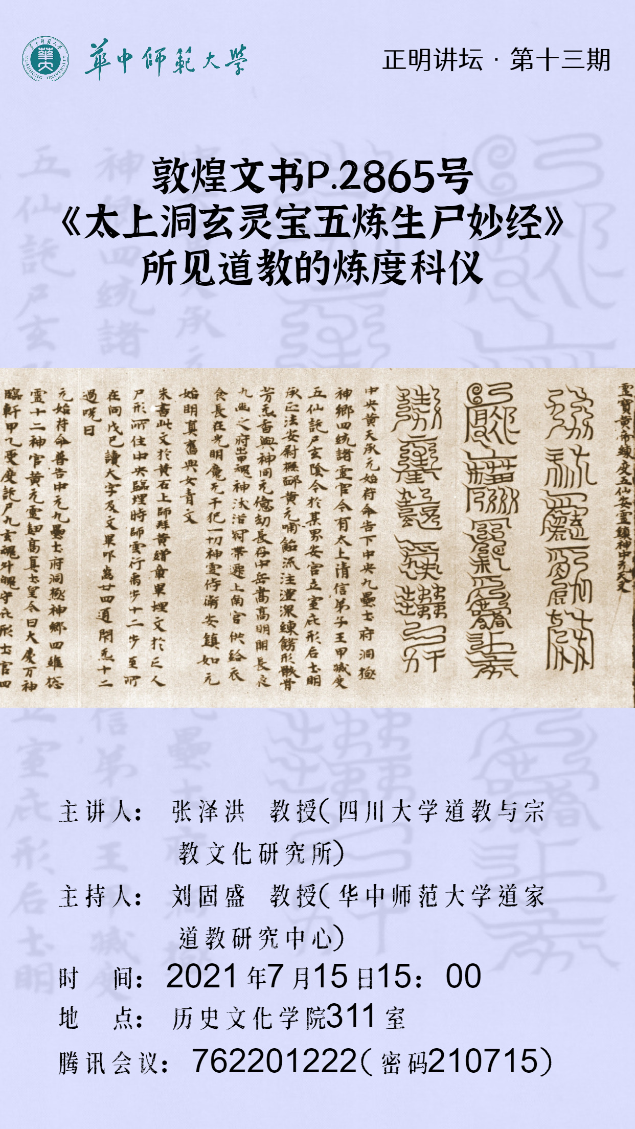 2021年7月15日下午,四川大学道教与宗教文化研究所张泽洪教授于历史文化学院311会议室作了题为“敦煌文书P.2865号《太上洞玄灵宝五炼生尸妙经》所见道教的炼度科仪”的学术讲座,道家道教研究中心主任刘固盛教授担任主持人与评议人,宋亦箫教授、肖海燕副教授、王闯副教授等也参加了讲座。本次讲座以线上、线下相相合的形式举办,海内外一百多位听众通过腾讯会议聆听了张老师的精彩报告。