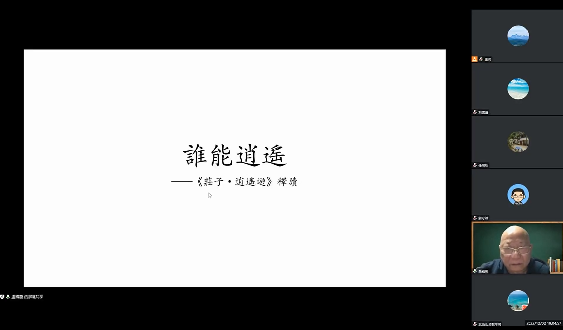 2022年12月2日晚,由华中师范大学道家道教研究中心主办的“道学讲坛”第四期成功举行。本次讲座由中国社会科学院世界宗教研究所卢国龙研究员主讲,主题为“谁能逍遥:《庄子·逍遥游》释读”,中心主任刘固盛教授担任主持人与评议人。本次讲座采用线上会议的形式进行,肖海燕副教授、王闯副教授以及中国人民大学姜守诚教授、湖北省道教协会副会长任宗权道长、武汉大道观和武当山道教学院部分道众等参与讲座。讲座听众人数突破300位,达到腾讯会议在线人数上限。