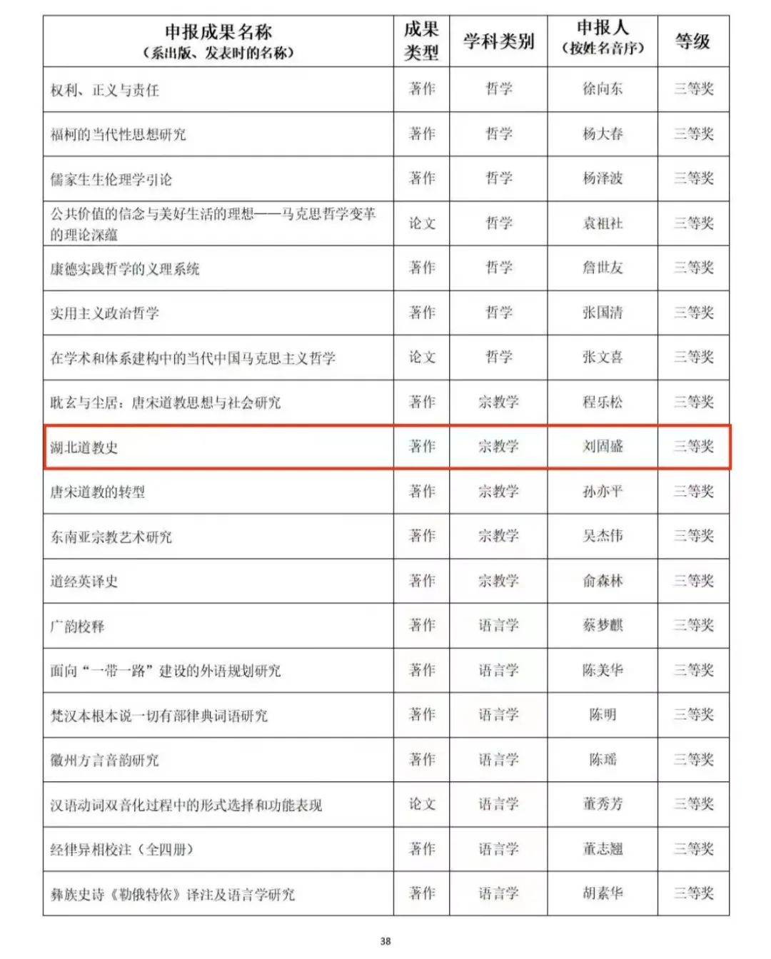 2月6日,教育部公布了第九届高等学校科学研究优秀成果奖(人文社会科学)评选结果公示名单,道家道教研究中心刘固盛教授等著《湖北道教史》荣获著作类三等奖。据悉此次全国宗教学学科只有8项成果获奖,难度很高,这显示出《湖北道教史》一书的学术价值突出,得到了学界的认可。