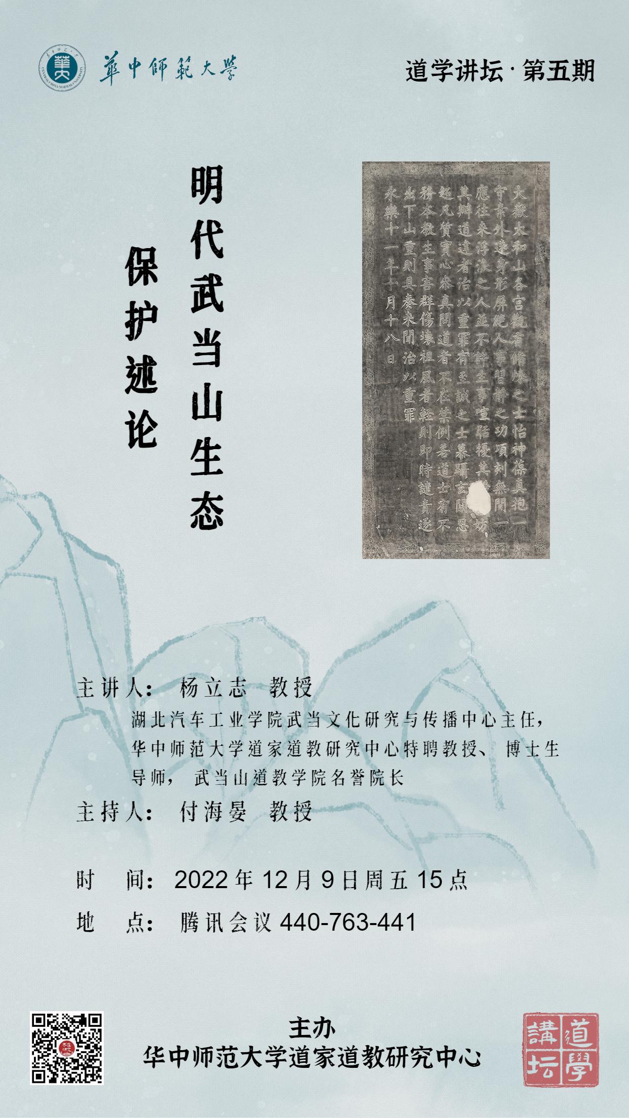 杨立志,湖北汽车工业学院原党委副书记,人文学院教授,湖北省人文社会科学重点研究基地武当文化研究与传播中心主任,湖北省高等学校“十四五”优势特色学科(群)——“武当文化与文旅融合”学科群首席负责人,华中师范大学历史文化学院暨道家道教研究中心特聘教授、博士生导师。担任湖北省武当文化研究会会长,中国道教协会道风监督员,武当山道教协会顾问,武当山道教学院名誉院长等。承担国家社科基金项目等课题20余项,著有《武当道教史略》(与王光德合著)《武当文化概论》等20余种,在《世界宗教研究》等刊物发表论文100余篇。
